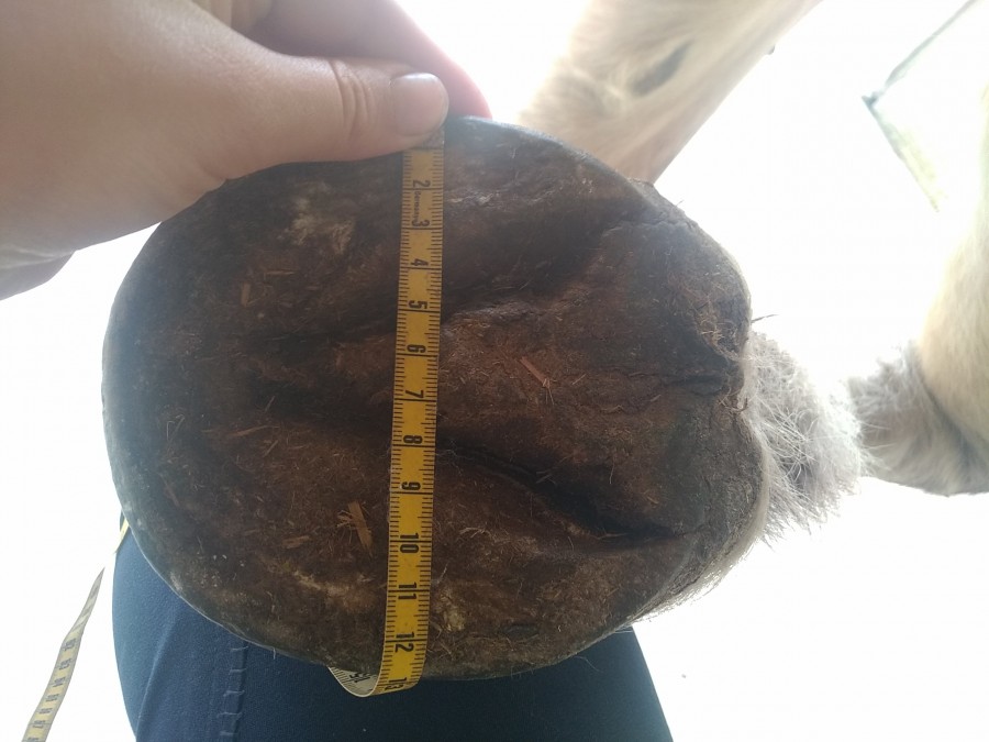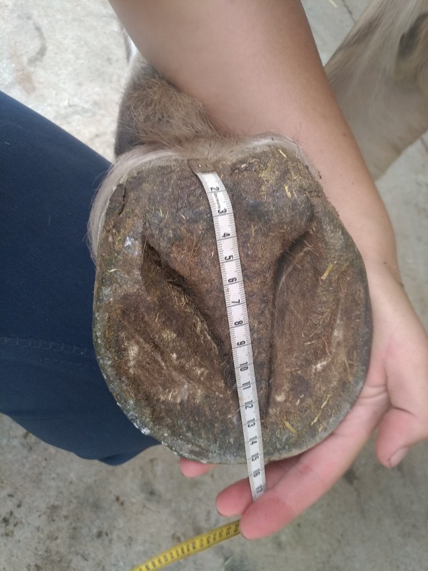 (Myrtille a toujours beaucoup usé en externe et nettement moins voire pas en interne... les différents pro qui ont vu ses pieds m'ont tous dit de ne pas trop chercher à la mettre à plat parfaitement sinon elle ne serait pas à l'aise, mais là c'est peut être un peu trop bancale !!)