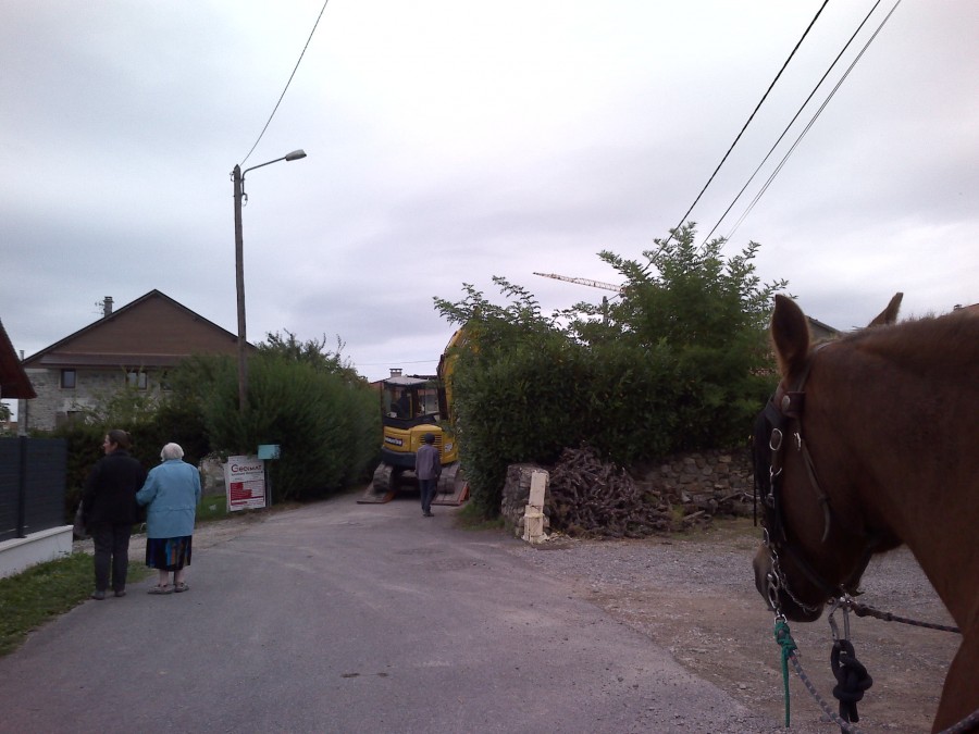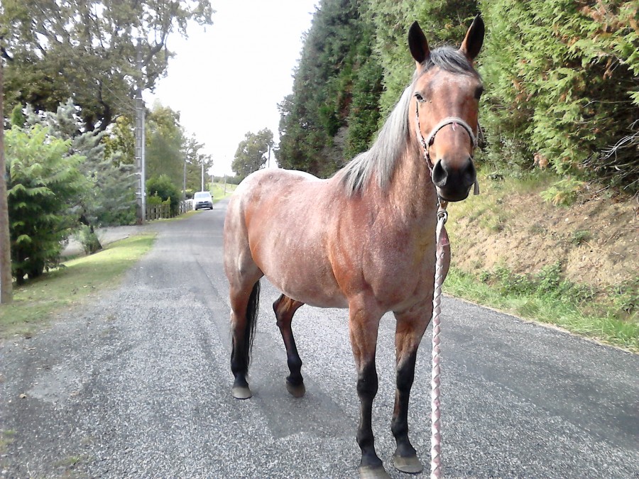 Du coup je me suis mis à la tête pour la guidé (et qu'elle s'habitue a "suivre" celui qui est à la tête ) Puis après je me suis remis derriere . Moi du moment où je suis à la tête elle est plus rassurée . Puis ça evite d'avoir besoin de lui tiré dans la bouche . En rentrant ça s'est mis à pleuvoir
