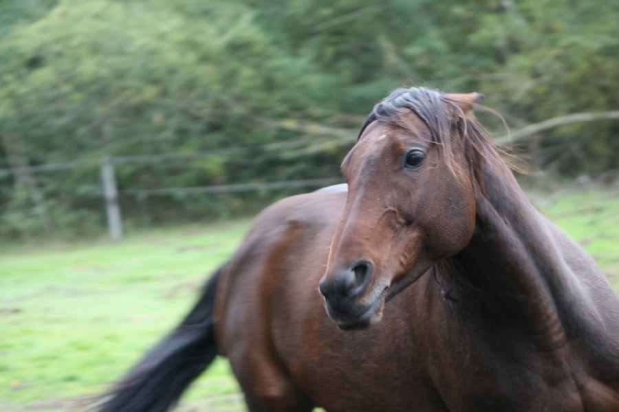 Elle a 11 ans et prends 12 cette année, elle a été débourrée mais ça fait longtemps qu'elle n'a pas été travaillée régulièrement surtout parce que je suis la seule à la monter et à la longer ( parce que j'ai pas peur ? ) C'est une jument très stressée depuis la naissance, elle chauffe et a de la transpiration de la tête aux sabots quand elle travaille. Elle gère pas sa fatigue. Elle ne supporte pas la tension sur les rênes ( il y un an on me l'avait mise alors que j'avais pas le niveau et elle s'est retournée et j'ai toujours pas le niveau je pense c'est pour ça je la monte que au pas avec ma prof ). Elle a un sacré caractère d'ailleurs