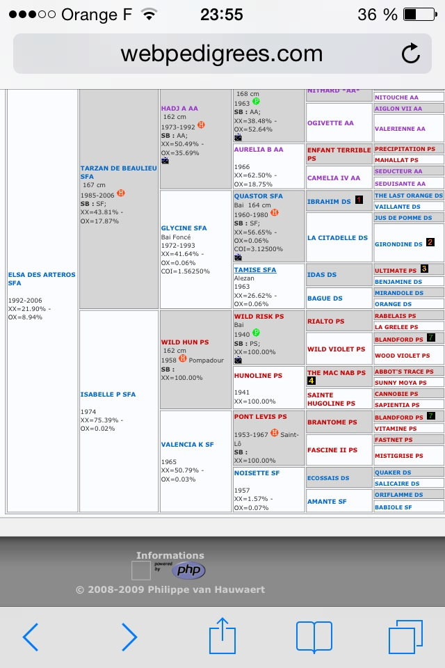 c'est plus trop à la mode mais c'est bien dommage. Tiens d'ailleurs Nabab tu peux peut-être le rajouter à ta liste ! Ou son fils London... Sacré étalon lui aussi, moins mastoc mais bon. Ah quoique, ça rajoute un inbreeding sur Almé... Ça fait peut-être beaucoup... Et j'allais proposer Chaman pour la souplesse et la jolie morpho ( et les moyens of course ) mais Galoubet aussi et donc Almé. Zut. Bon après c'est un petit inbreed, ça le met loin dans le papier mais ça permet de fixer un peu ses qualités... C'est pas une mauvaise chose