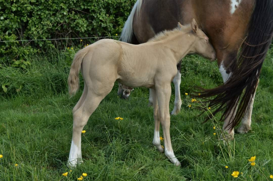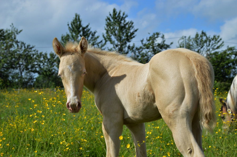 Pour faire simple il est noir, porteur de 2 gènes crème et d'un gène champagne. Pour le pie il porte 2 gènes tobiano et ne produira donc que des poulains pie (même s'ils peuvent être minimal comme lui