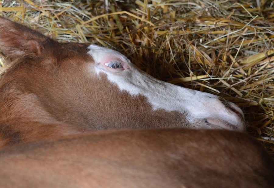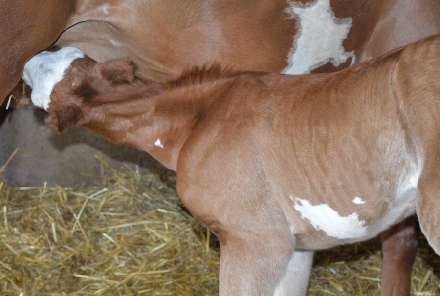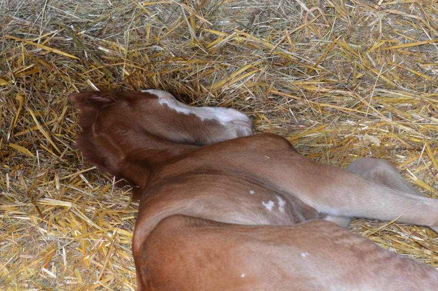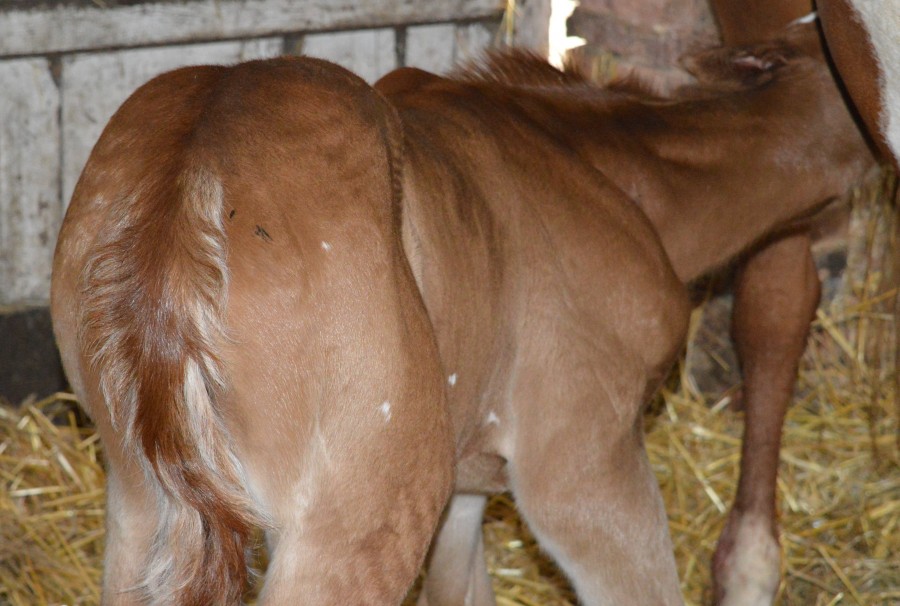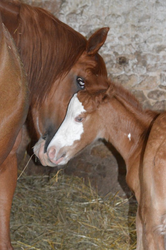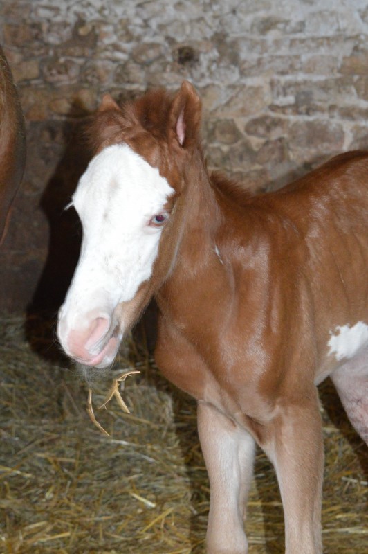 Je suis très fière de vous annoncer que ma belle Ushuaia à donné naissance cette nuit à une superbe pouliche alezane overo aux deux yeux bleus. Tout le monde se porte à merveille et la petiote est déjà très dynamique!