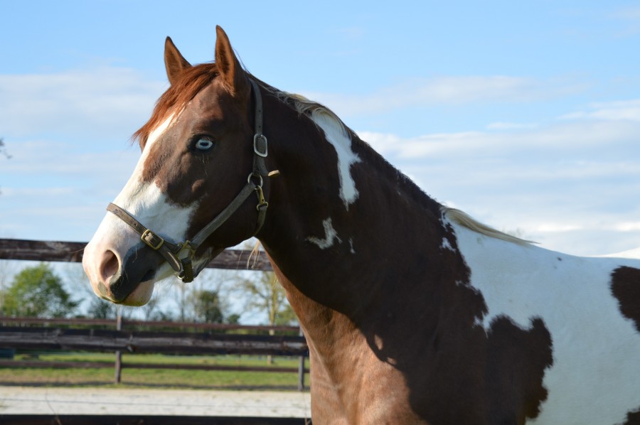 - Dior (Paint horse) buckskin tobiano (homozygote) aux yeux bleus