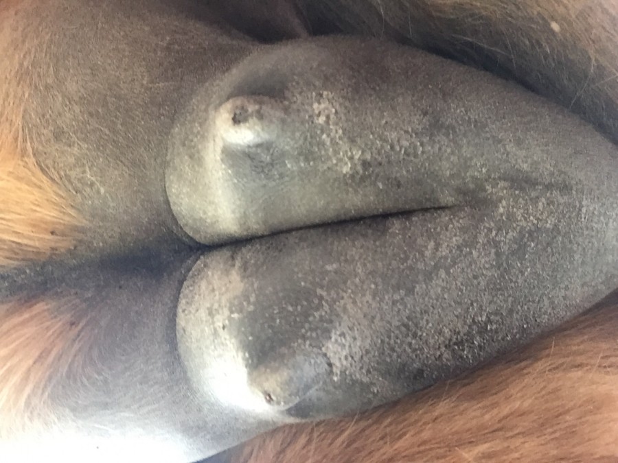 Voilà, je voulais vous demandez si c'est normale que les mamelles de ma juju (à 308 jours de gestation) commence à gonfler légèrement, normale, mais c'est comme un boule dure...Sa ne ressemble pas du tout à du lait! Sa n'a pas l'air de la déranger quand je lui touche, ce n'est pas plus chaud que mes autres juments...J'ai essayée de ''traire''(je n'aurais pas du??) et une mini goutte blanche claire est sortie! Mais ce qui m'inquiète c'est que c'est dure..