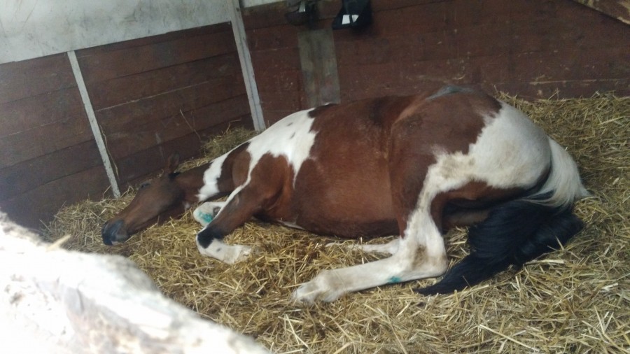 bon sinon triste aprem.. un cheval est mort aux écuries .. il est passé sous sa barre de Box, s'est bloqué, a forcé et est retombé ensuite . il ne tenait plus debout, en 10mn il est parti