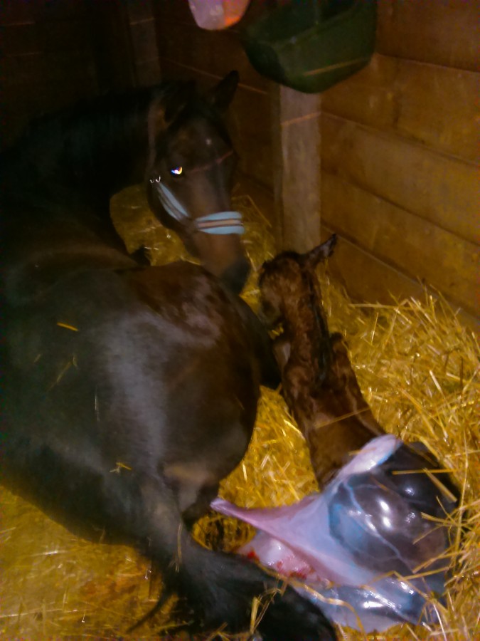 Ça y est bébé est né !!! Une magnifique pouliche baie avec deux balzanes et une liste tout s'est bien passé !