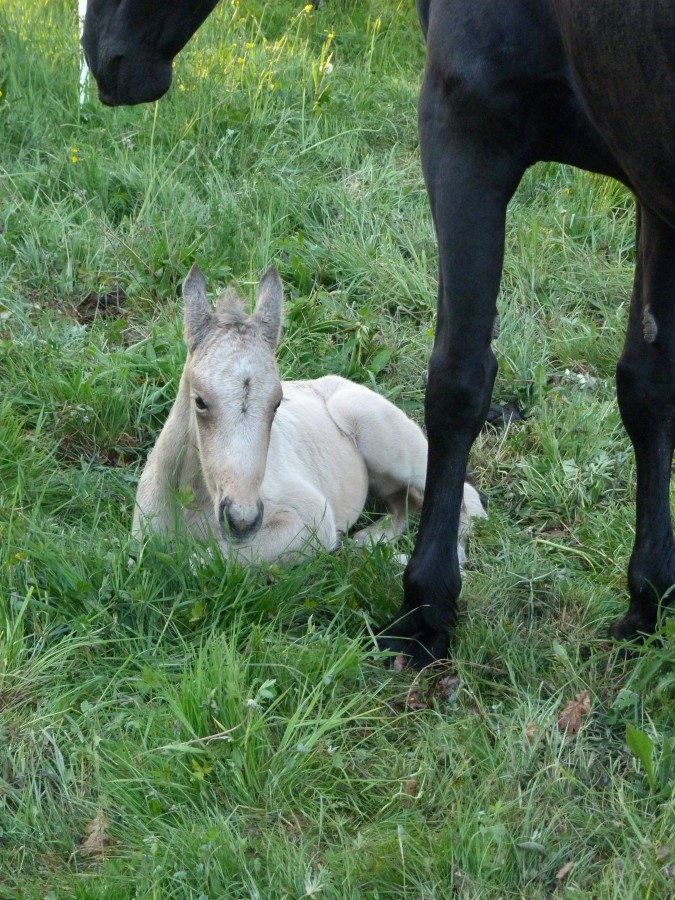 Comme prévu HEAVEN est née cette nuit, avant l'aube, c'est une pouliche toute en jambe. Elle augmente donc le quota de fille de Brujo cette année avec une jolie couleur Isabelle claire, une petite entête en couronne ou flamme pour qui préfère et je suspecte des balzanes mais rien de sûre, il semblerait aussi que la robe soit un peu charbonné dessous. Maman va très bien et mademoiselle est très curieuse. Un petit bonheur numéro 2.