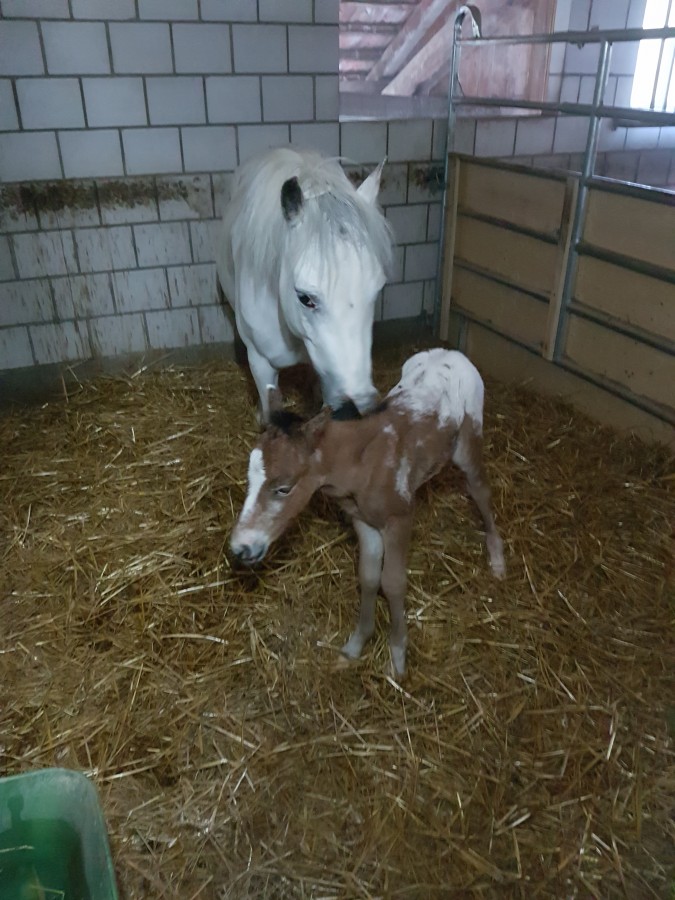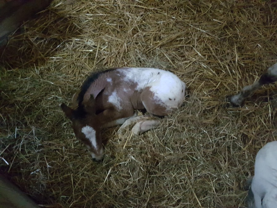 Hélite, pouliche pie minimal bai née le 10/04 à 2h30 Décédée le 14/04
