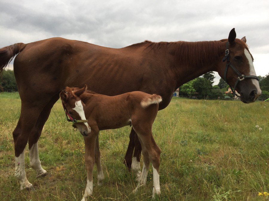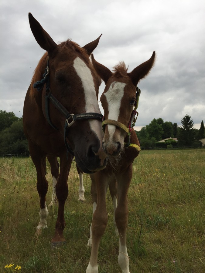 Quad est aussi protectrice, l'année dernière c'était vraiment tendue. J'ai tout simplement attendue que elle soit prête à me laisser approcher la pouliche pour que ça se fasse dans de bonnes conditions. Au début j'ai essayer de licoler rapidement, habituer rapidement à ma présence puisqu'il y avait des changements de prés réguliers à faire mais c'était pas la bonne méthode ça stressait juste la mère. Maintenant changements de pré ou pas je laisser venir, même si ils mettent quelques semaines ^^