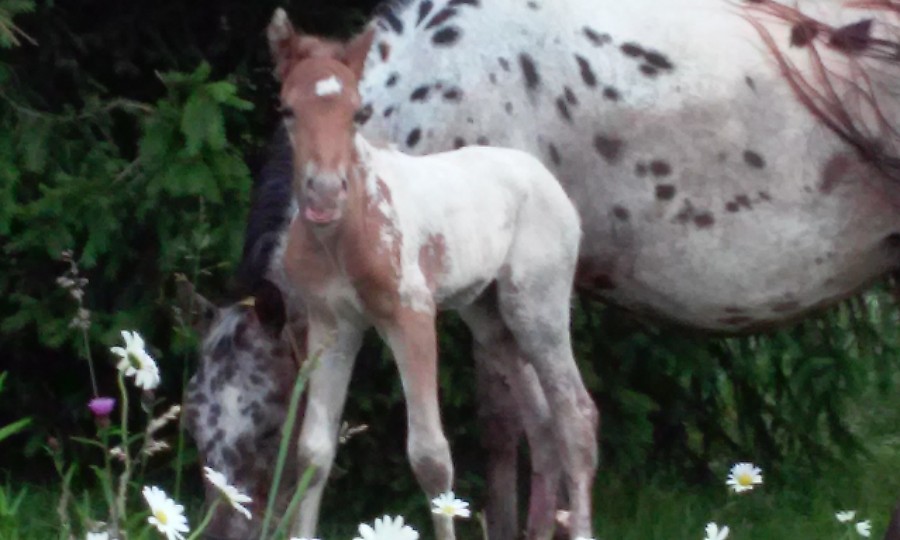 photo du poulain Appaloosa x Paint horse à quelques heures de vie ( qui est à vendre si intéressé, parfaitement manipulé et très gentil)