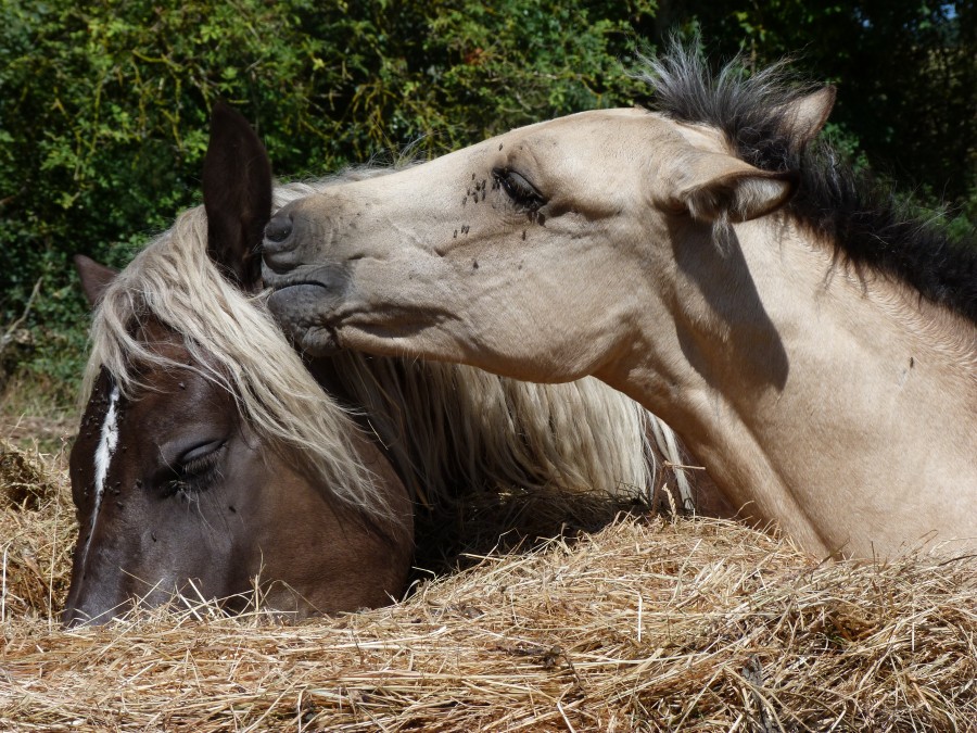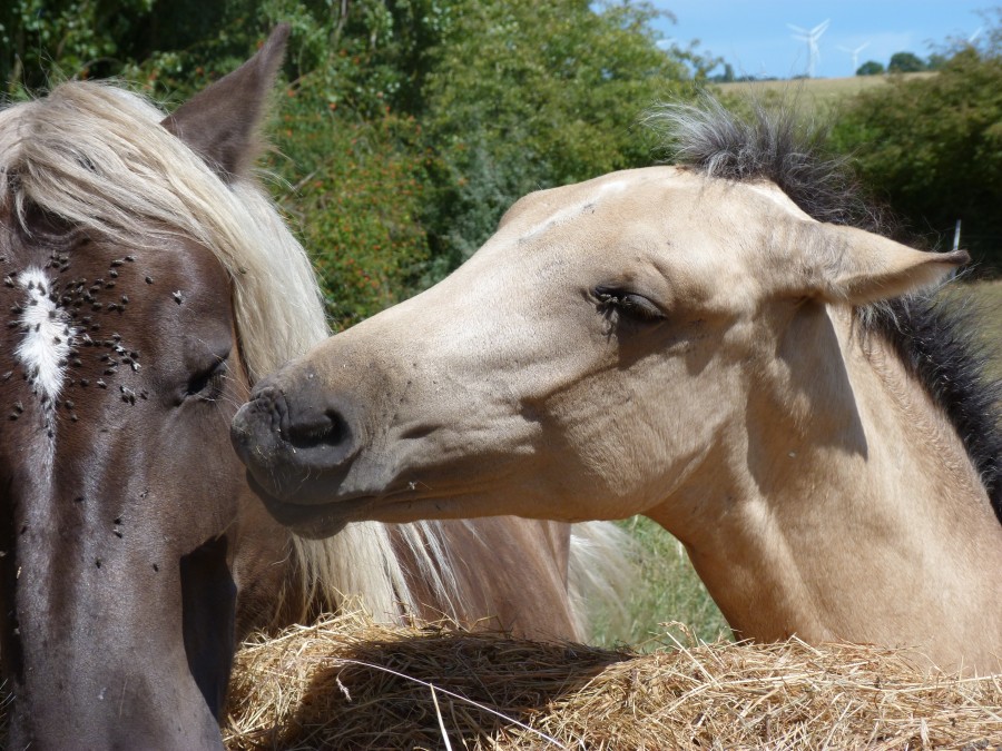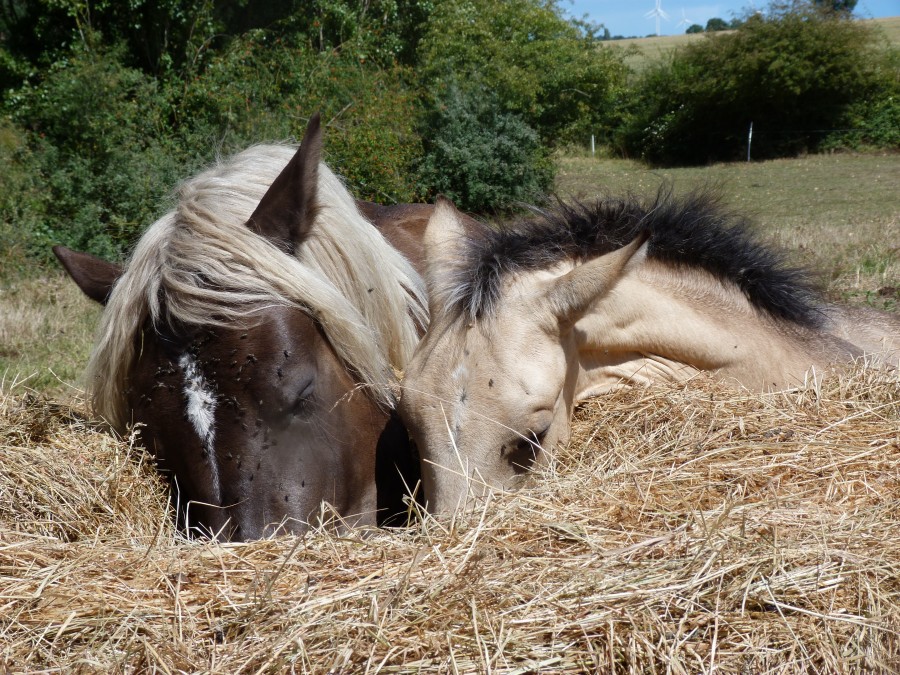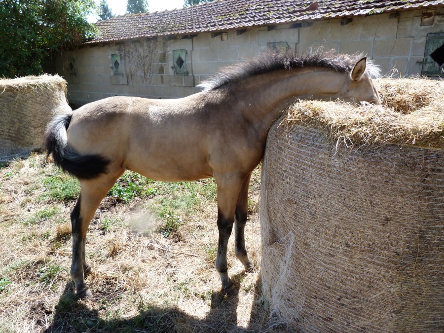 Coucou tout le monde, dis donc, qu'est ce qu'il change les poulains. D'ailleurs icchos qu'est ce qu'elle a grandit ta petite alezan, c'est dingue ^^ nous ici, ça grandit, on est à 1m30-1m32 au garrot et un peu plus sur la croupe. Heaven à maintenant un vrai troupeau avec elle. Ma maman ayant ramener ces 3 autres chevaux, ça lui change à la miss. D'ailleurs on a dû mettre du foin, alors madame découvre, on a l'impression qu'elle s'y cache aussi hihi