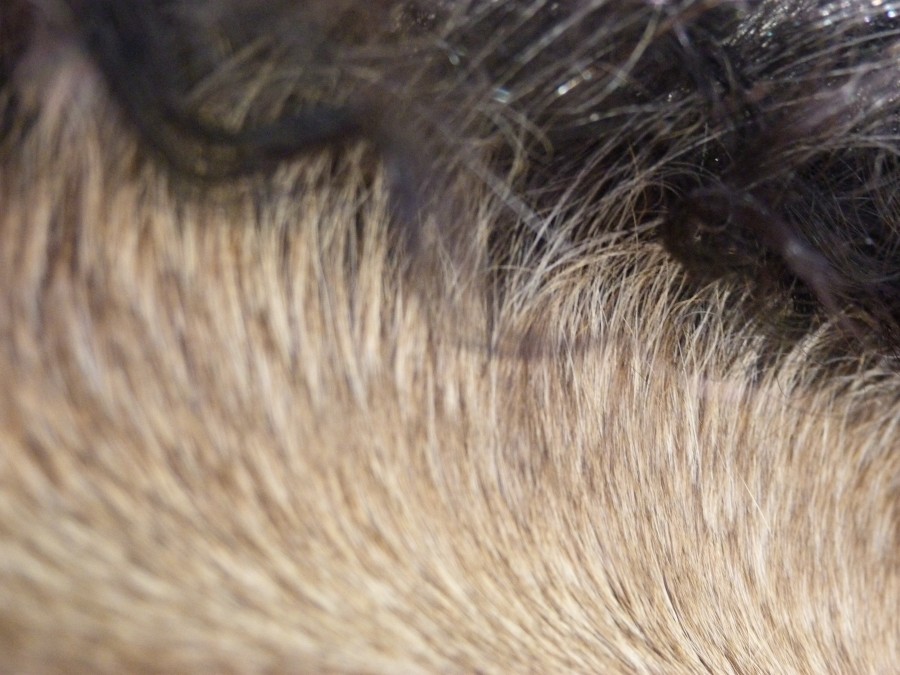 l'ulcère a bien évolué et la partie dorsale de la cornée apparait translucide. La pouliche accepte les soins directement dans