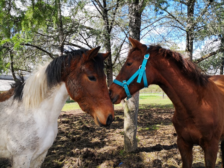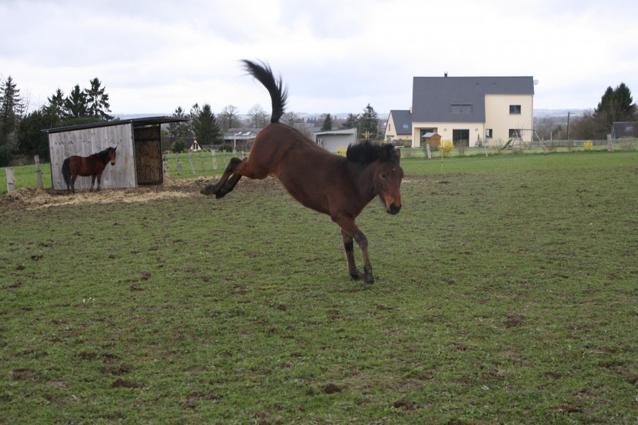 Il fait son petit chef (c'est le seul mâle du groupe, et il n'est pas encore castré) il fais l'étalon, et à tendance à faire comme si une de mes pouliches ( 1m40) de 3 ans était sa juju attitrée la pauvre, il la dirige en lui mordillant les flancs, et je crains un peu le moment ou elle viendra en chaleur...