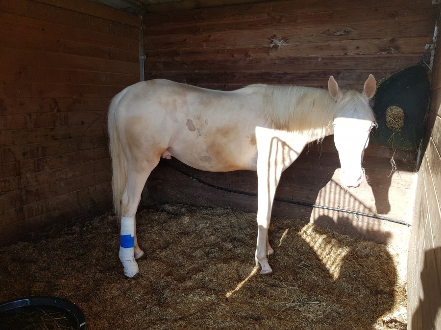 a l'heure actuelle il ne peut ramener son sabot sous sa jambe et marche donc sur le boulet.