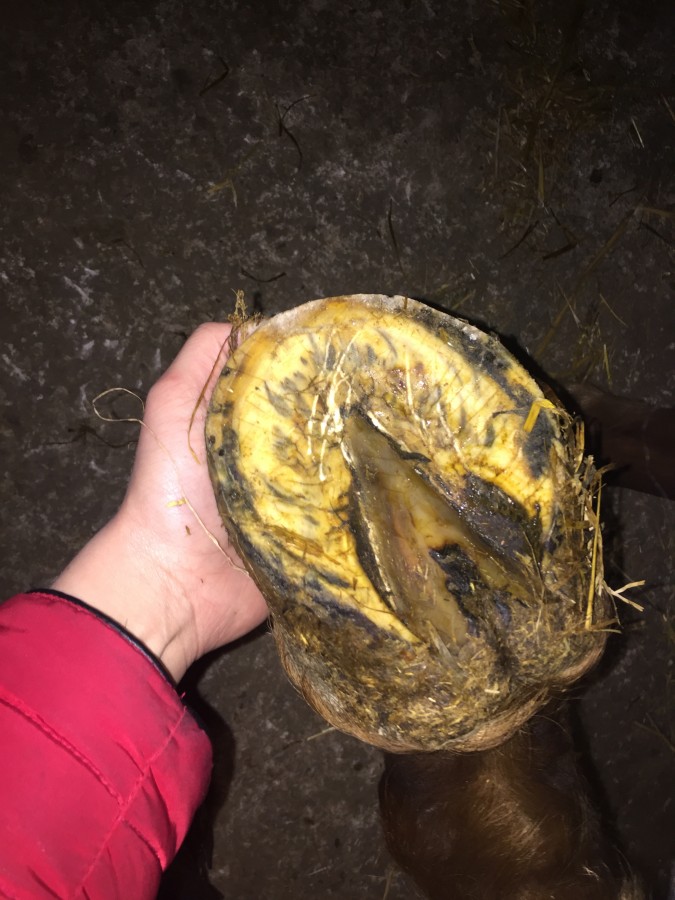 J'ai décidéz avec l'approbation de mon maréchal de déferrer ma jument des quatre pieds. Donc elle a étais déferrée jeudi 14 janvier c'est à dire il y a 3 jours, jeudi elle marchée comme sur des œufs mon maréchal a dit que c'étais normal, vendredi aussi, samedi aussi, et ce soir je suis allé la voir, elle ne peut pas marcher 5 mètres elle boite comme je ne sais pas quoi, mais vraiment 5 mètres c'est un énorme exploit. Elle a de l’arthrose aux postérieurs, ce soir, son jarret, son canon et son boulet étais énormément enflé...