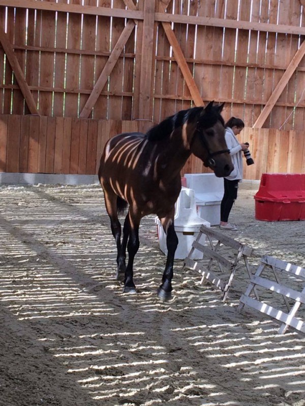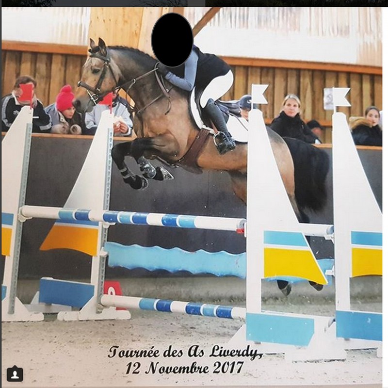 Il a fait ses premières sorties en concours, et même si le fait de débourrer tard fait qu'il est encore vert, il est de très bonne volonté, il sort en 4 points sur ses deux derniers tours, juste parce qu'il adore regarder un peu partout: les concours c'est super pour lui, il y a un tas de choses qui l'émerveillent, il n'a peur de rien et tout est source de curiosité, donc parfois il en oublie de se concentrer. Mais ce sont des erreurs de jeunesse, et je suis ravie de son comportement et de ses capacités.