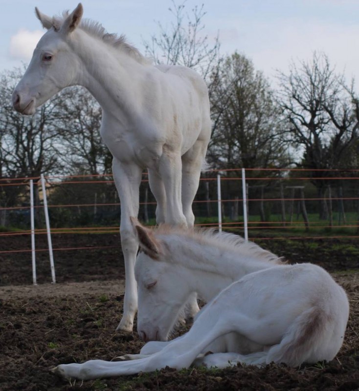 Je pense par exemple à Vicomte des Neiges, qui est porteur des deux patrons. 50% de sa production est pie, 50% dominant white. Voici par exemple deux de ses poulains DW: