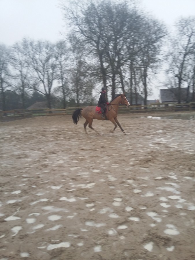 Après presque 2ans de travail, (quelques mois seulement avec le mors, avant il étais en hack), j arrive ENFIN aa avoir loulou en place, et même en extension ! Au pas et au trot après une grosse détente il est bas , rond, un peu enfermé mais bien bas et avec de l engagement et travail du dos, donc je ne m arrete pas à ce détail.
