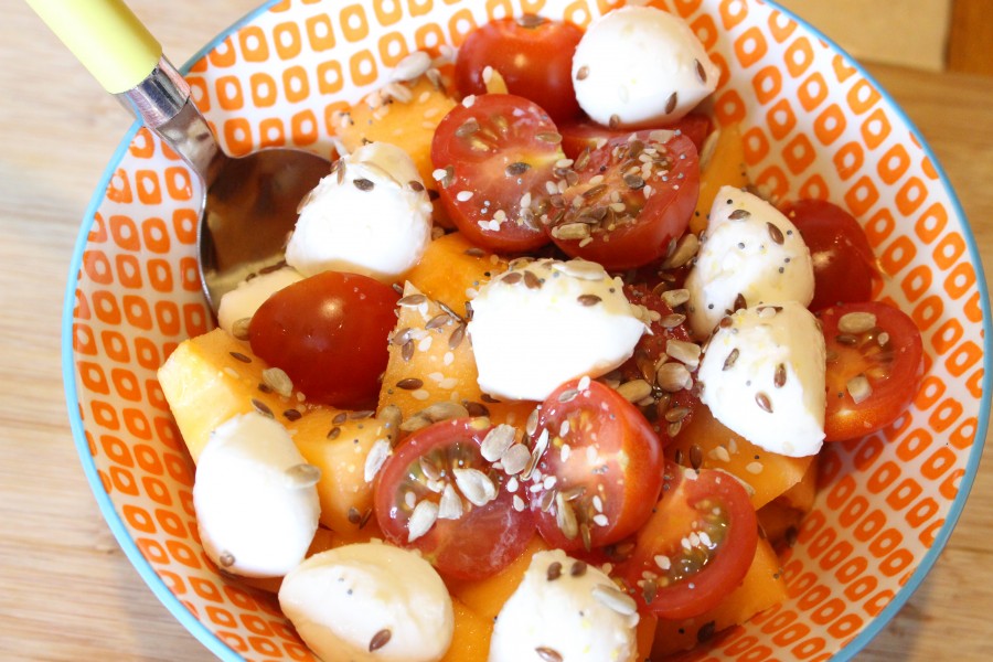 Du coup c'était salade de melon, tomates cerise, mozza avec un mélange de graines enrichies en oméga 3 et en différentes vitamines avec un filet de vinaigrette, voilààààà