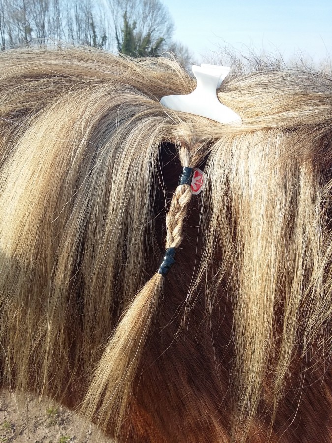 Pour la fixation, j'ai fais une natte dans la crinière (avec élastiques à deux endroits). J'ai pris une mèche du dessous, donc la natte ne se voit même pas si on ne soulève pas les crins.