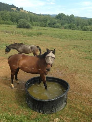 Juste ce que je regrette c'est que c'est un "boulet", oui elle joue avec tout ce qu'elle trouve, on a l'impression qu'elle s'ennuie très rapidement, qu'il y ait un,deux ou 3 chevaux avec elle elle trouve toujours quelque chose pour jouer et finalement se faire mal (elle s'est ouvert les glomes 3-4 fois), plusieurs ouvertures (au-dessus de l'oeil, poitrail...etc), il n'est pas rare qu'elle prenne des bains dans l'auge