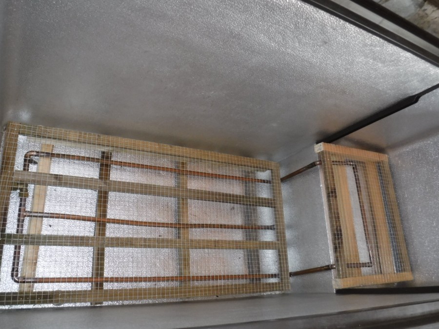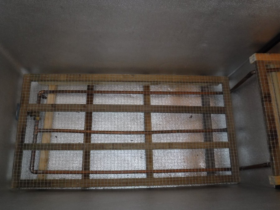 Chez moi, j'ai les tuyaux en cuivre au fond surélevés de 1cm, et j'ai 4 grosse brique dans les coins sur lesquels je pose un grillage pour que le foin ne soit pas sur les tuyaux etles trous directement