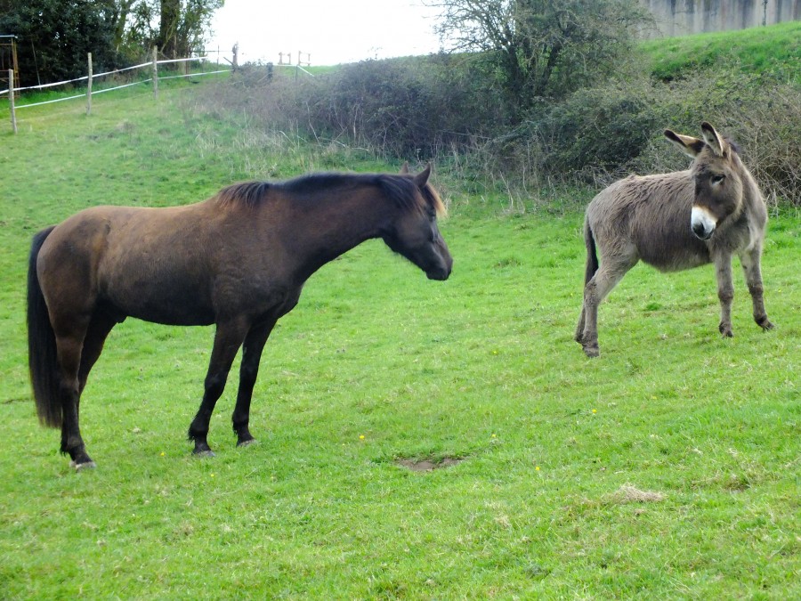 Contrairement à ce que je pensais, Cybèle s'est faite toute petite, pas rassurée la mémère ! Mais bon, ils ont quand même passé pas mal de temps proches l'un de l'autre, c'est juste qu'il faut pas venir la coller sinon elle le fouette avec sa queue J'ai vu une mini ruade, mais elle ne lance jamais les postérieurs donc pas de souci. Lui, aucune agressivité, juste méga curieux quoi