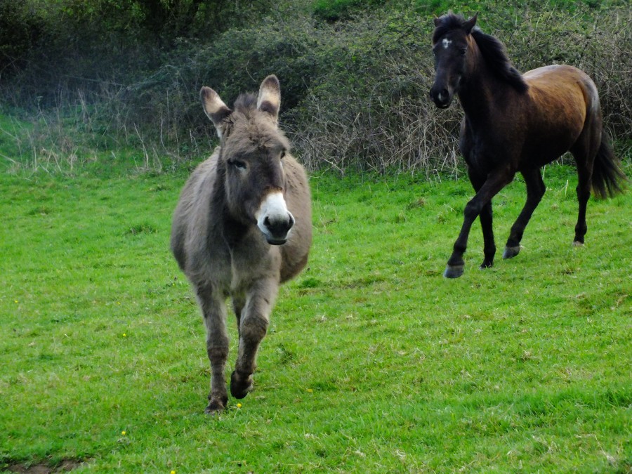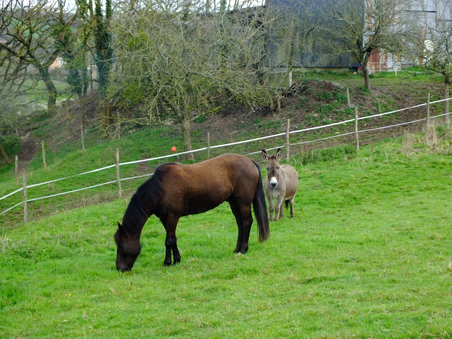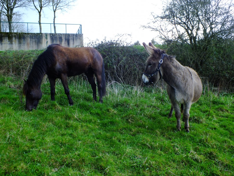 Après réflexion, j'ai décidé de le mettre direct avec mon ânesse. Étant un grand stressé, je me suis dit qu'il vivrait mieux le changement en n'étant pas tout seul. Je pense que j'ai bien fait parce que dès qu'il ne la voyait plus, il hennissait et partait en live.