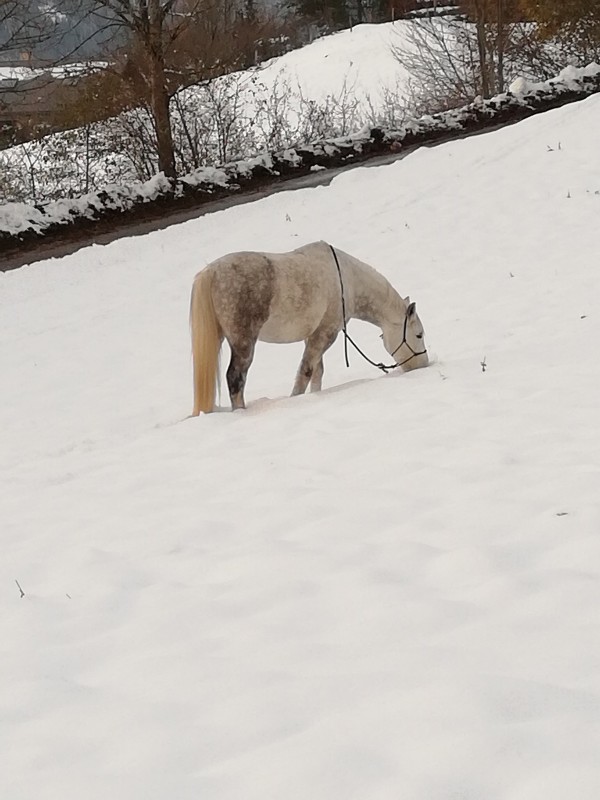 Du coup on a créé un partenariat, je grattait dans la neige pour faire un trou, puis il broutait. Ainsi de fil en aiguille il a commencé à comprendre qu'il y avait de l'herbe sous la neige et à commencer à gratter avec son nez à différents endroits.