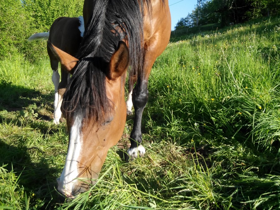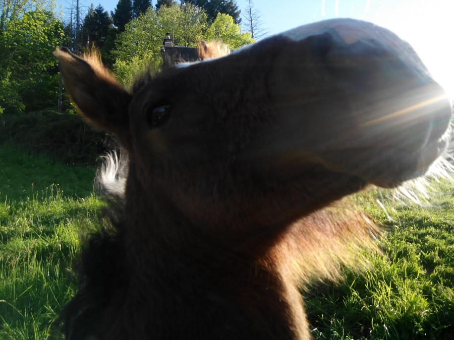 Enfin oui, comment être tranquille lorsque l'on est assis au milieu d'un champ avec un poulain dedans !? En plus j'avais prévu que si je faisais de photos de Granola je me devais de faire des photos de Nescafé, elle est magnifique cette grosse patate aussi ! D'ailleurs quand je suis arrivée elle a "huhumer" avec ses naseaux pour dire "bouffe" (bon je ça mignon quand même) pis elle est venue me voir, se laisser caresser comme une gentille mémère, les brins d'herbes les meilleurs étaient étonnamment entre mes jambes... Bref, cession lecture reportée hein !