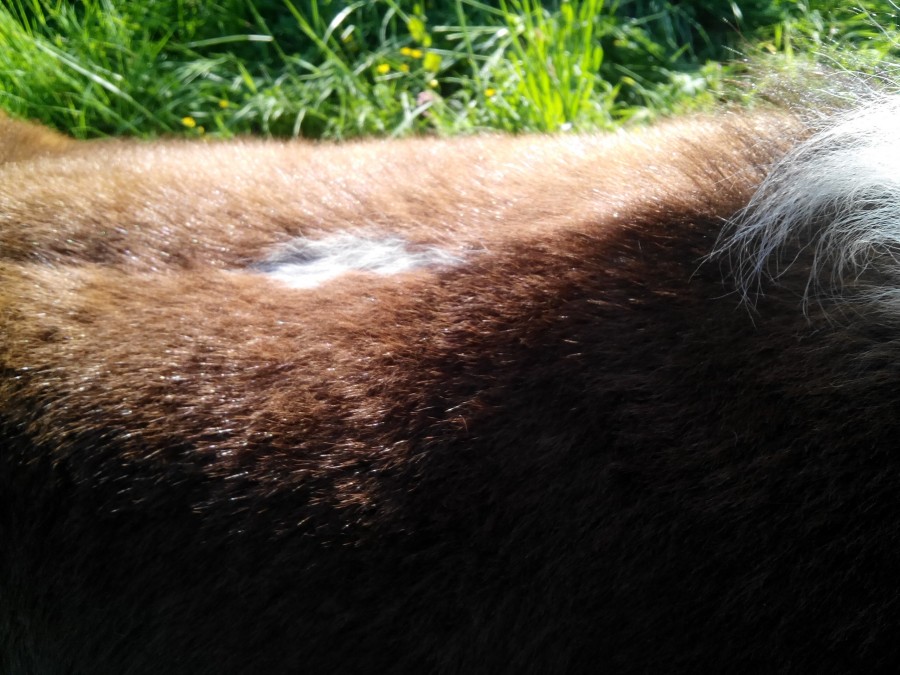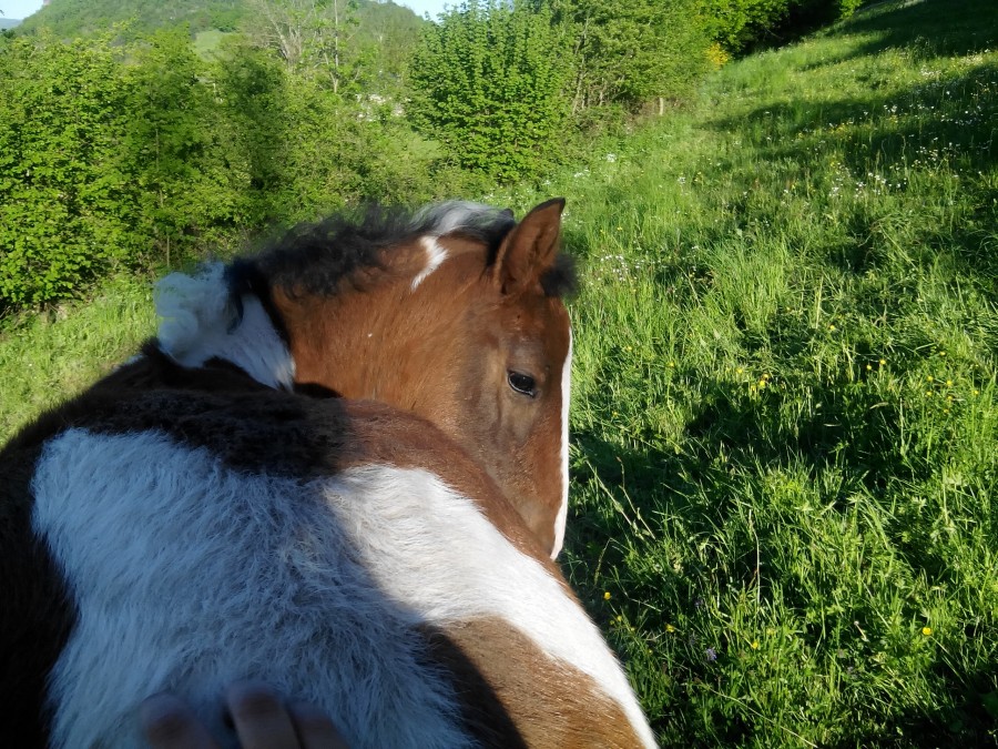 Du coup j'ai caressé Nescafé à fond, d'ailleurs elle aurait encore besoin d'un coup de brosse (on appellera l'homme à la rescousse !) et j'ai pu toucher ses mamelles et tout, un amour cette jument, aucun regrets ! Pis bien sûr la demoiselle se demandait se que je faisais à sa maman adorée ! Du coup je me suis dis, aller, pourquoi pas la tripotée un petit peu. Du coup je tends la main et lui touche l'épaule 2 secondes, elle essaie de s'échapper puis reviens. Je la retouche et ainsi de suite puis elle bouge de moins en moins. Je commence alors à lui gratter le garrot et là.... oh mon dieu changement radical de comportement. Granola se transforme en chameau ! En plus en grattant (ce qu'elle adore mais carrément) je remarque une toute petite tache sur son dos trop choupi !