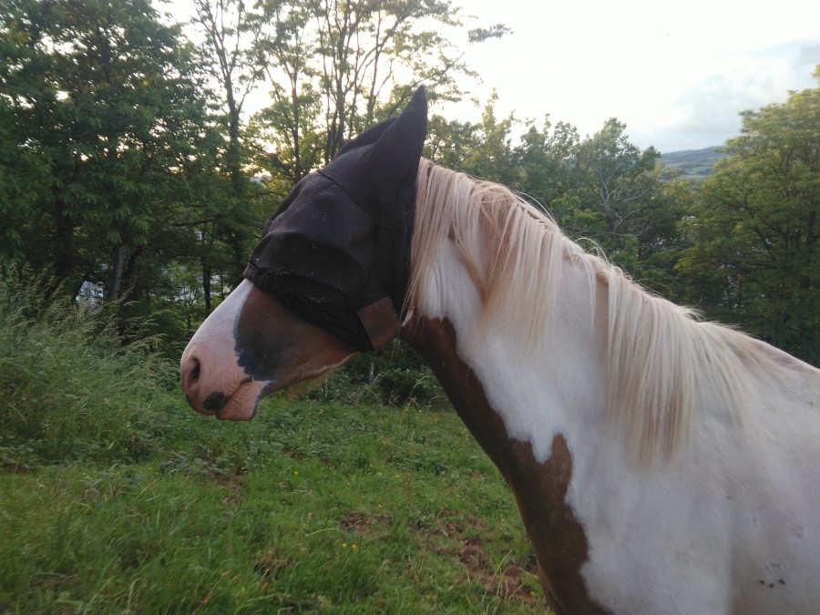 Ce soir Dexter avait aussi l'oeil gauche assez gonflé du coup j'ai mit un flymask pour la nuit en espérant que ça dégonfle, sinon demain véto ! Le flymask à beaucoup perturbé Granola j'étais morte de rire