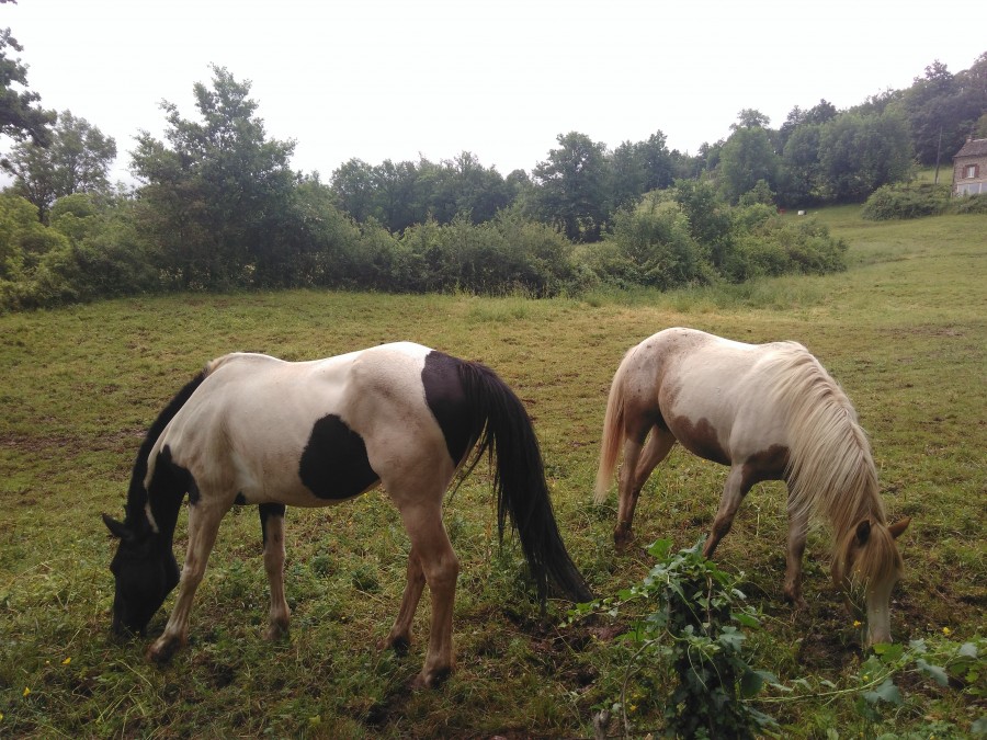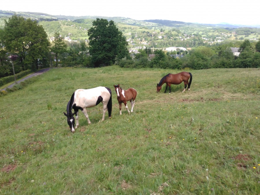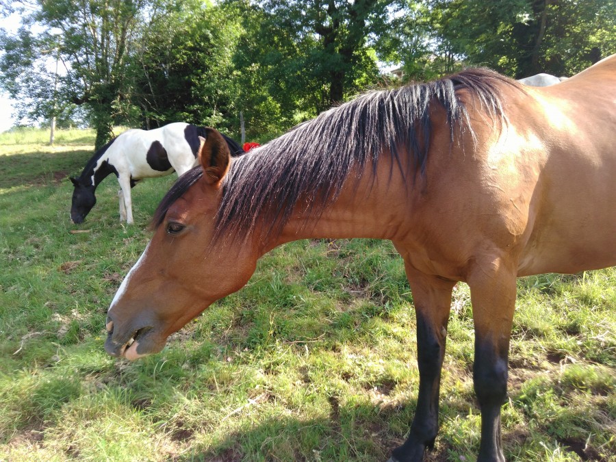 Les chevaux étaient en haut et l'entrée en bas donc j'étais contente. Naturellement Bohitika est allé rejoindre le groupe et s'est mise à brouter normalement comme si de rien n'était. Les juments étaient à 10m l'une de l'autre sans aucun signe d'agression. J'étais aux anges ! Maintenant pour écarter les chevaux Nescafé baisse juste les oreilles et ça suffit. Limite elle ne s'occupe plus de Granola qui se fait courser par Dexter