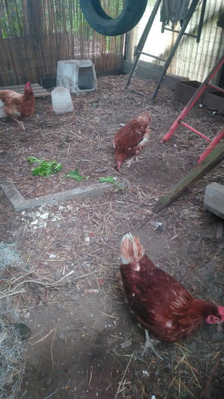 Hé bien j'ai pu retrouver 2 poulets pour tenir compagnie à ma pauvre rescapée. Poulets de réforme idem, ça tombait bien ils étaient dispos de suite. J'appréhendais un peu mais ça s'est très bien passé. Je les ai laissées enfermées au début, en laissant l'autre venir voir et ressortir. Puis arrivé au soir, j'ai enfermé tout le monde. Ma pauvre poulette comprenait pas trop le délire (c'était comique sa tête quand elle les a vues :p) et restait dans son coin, mais pas de bagarres ni rien. Les 2 autres par contre sont de vraies warriors, à peine arrivées elles foutaient leur tête dans la porte pour sortir
