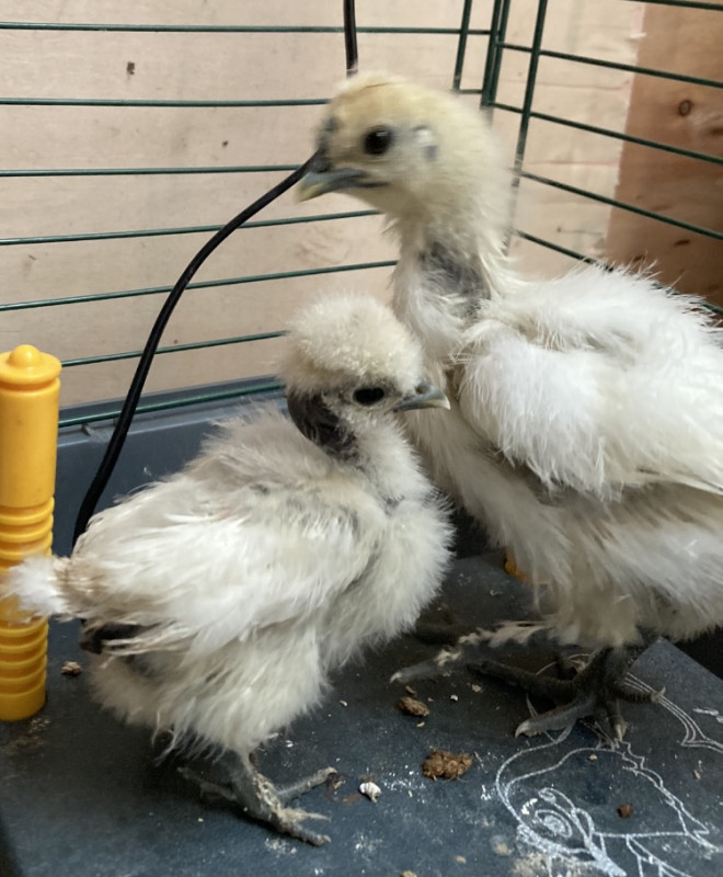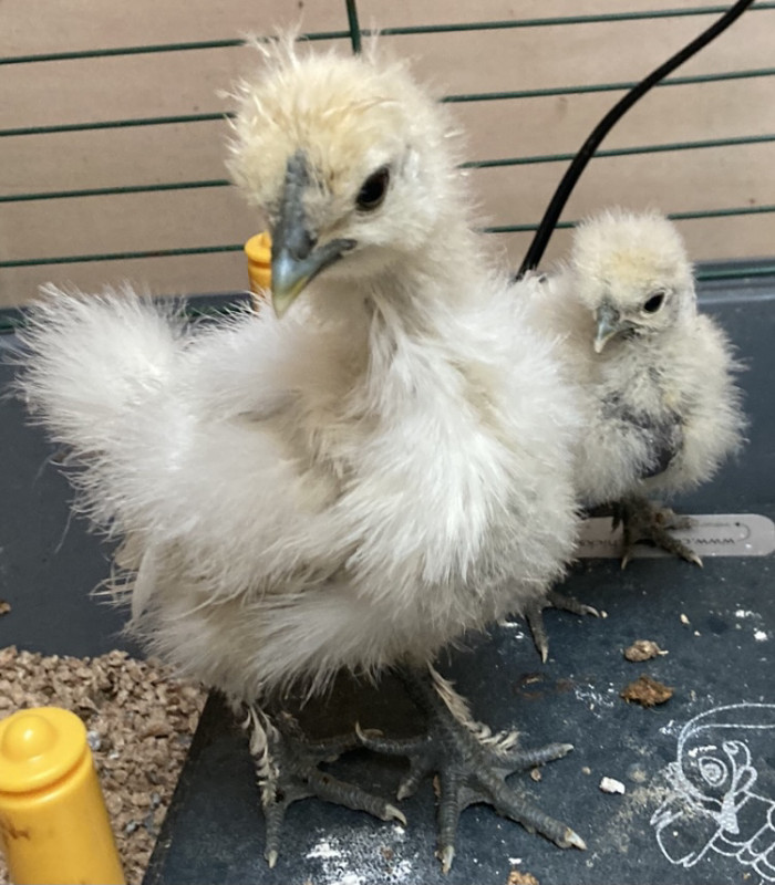A mon avis on aura une poule de soie extra naine par contre! Il fait la moitié du poids de ses frères et s?urs. J'espère que c'est une poule et pas un coq.