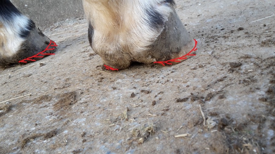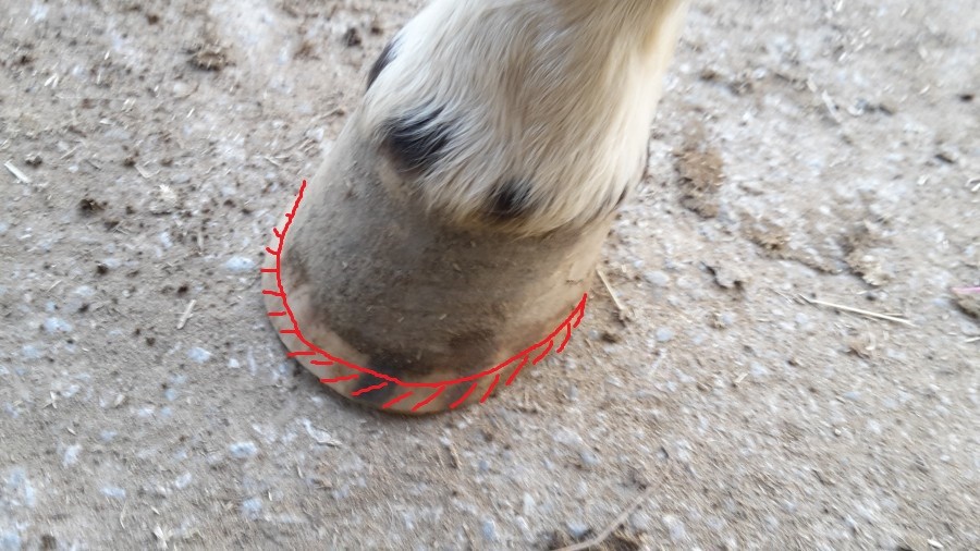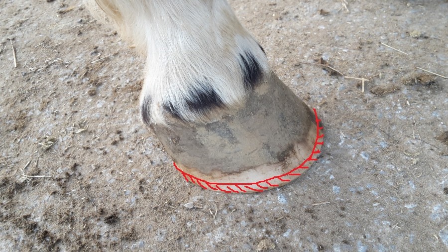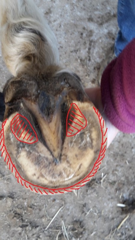 A première vue (mais cela n'engage que moi), la paroi est trop longue (à réduire par le dessus et à égaliser avec le niveau de la sole par le dessous), les barres sont trop présentes, les talons ne semblent pas vraiment à la même hauteur et la fourchette n'aurait pas dû être autant taillée.