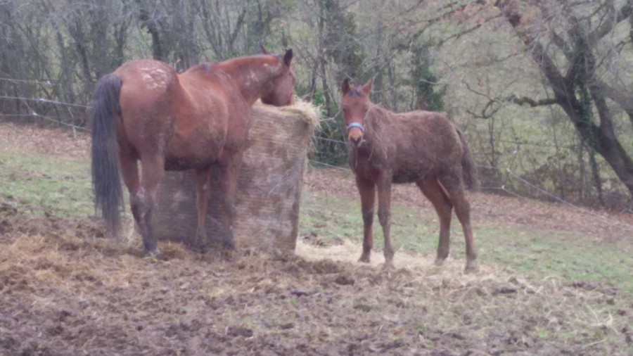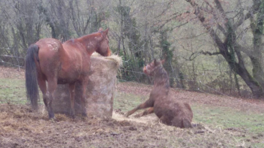 Aujourd'hui 1ers exercices de marche en longe avec Gajar. Petitou a été pris de panique et s'est enfui avec la longe, on a laissé faire, et il est revenu tout essoufflé près de sa mère...