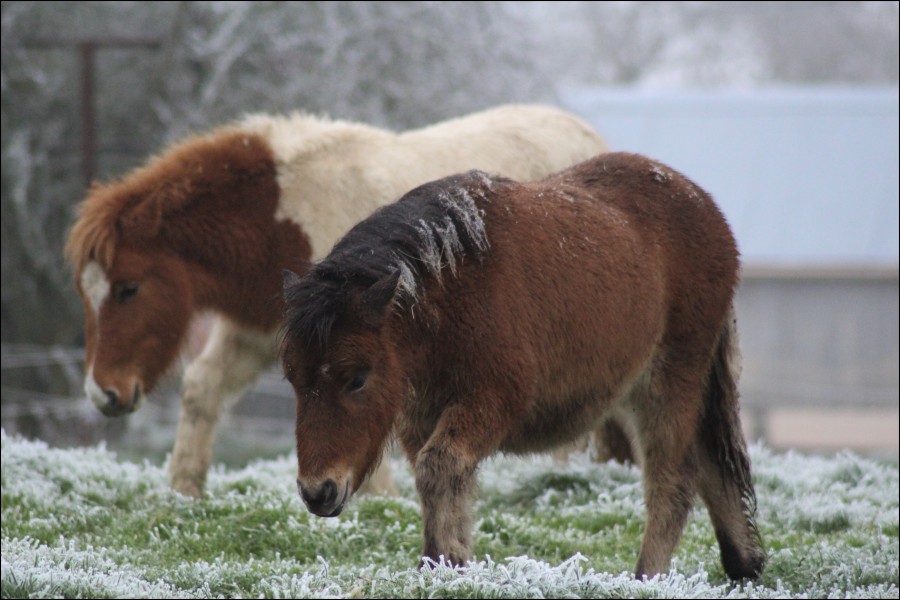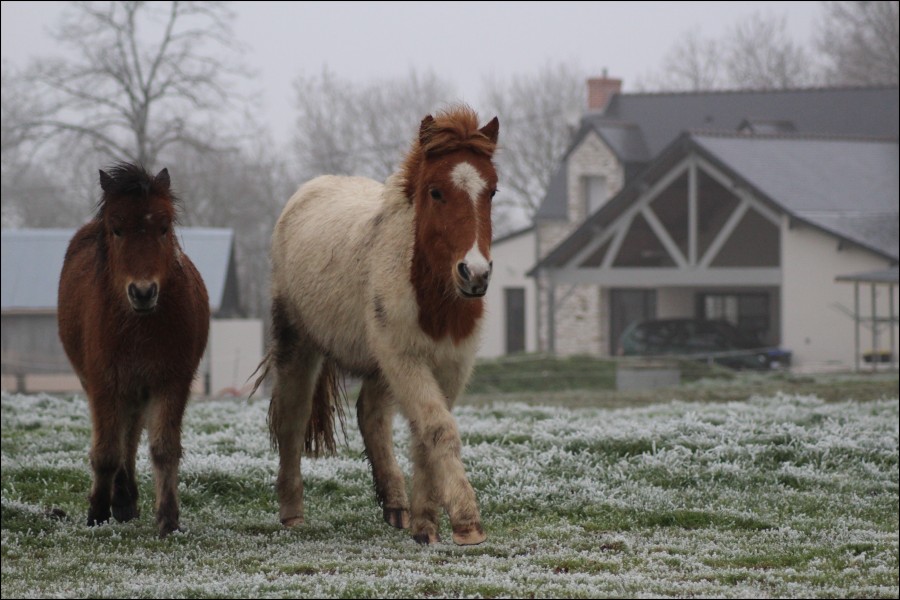 Il y avait du givre un peu partout, j'ai voulu aller faire quelques photos, donc j'ai fait un pansage rapide pour les deux affreux (Quittou a la passion de la boue, et j'ai l'impression qu'il l'enseigne à Gaïa !).
