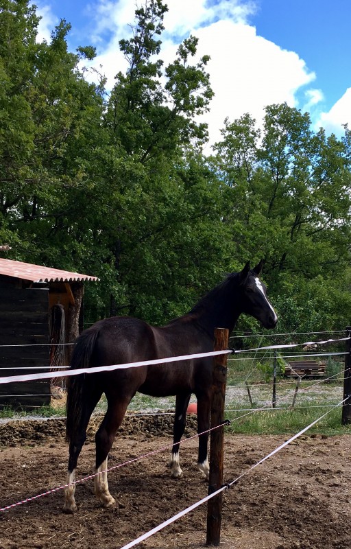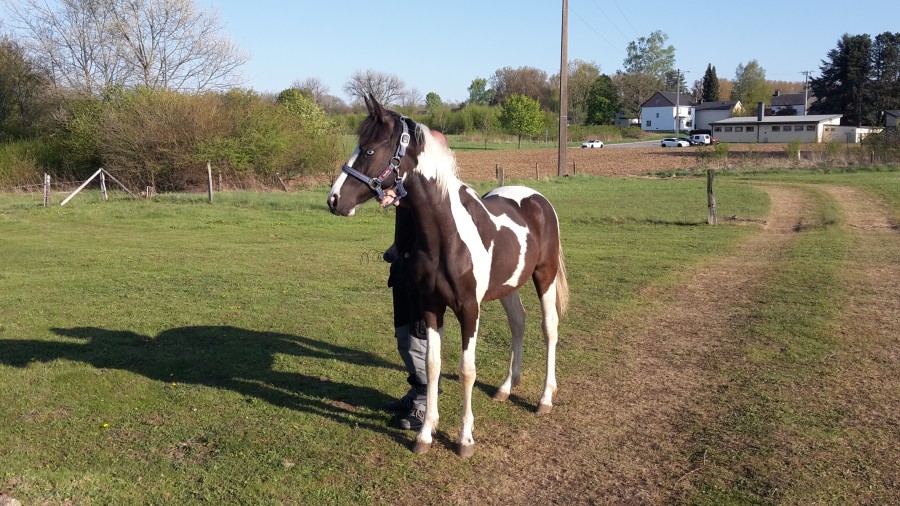 On est arrivé chez mon amie, il était un peu stressé, il a couru pendant 15/20 min comme un fou, il fesait le tour de la pature à la recherche d'une sortie j'ai l'impression, il est même tombé mais ouf pas de mal juste une jolie glissade.