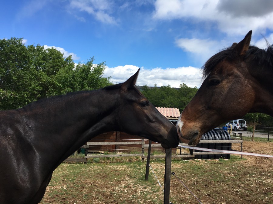 Après sa course folle il s'est détendu et a commencé à brouter. Il suit la jument de mon amie partout. Au début elle le chassait quand il venait trop près mais le lendemain c'était déjà fini.
