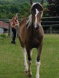 Description : Alezane (surement future crins lavés et peut-être brûlée) avec une grande liste originale en forme de 7, deux chaussettes (balzanes) aux postérieurs et une petite sur un antérieur