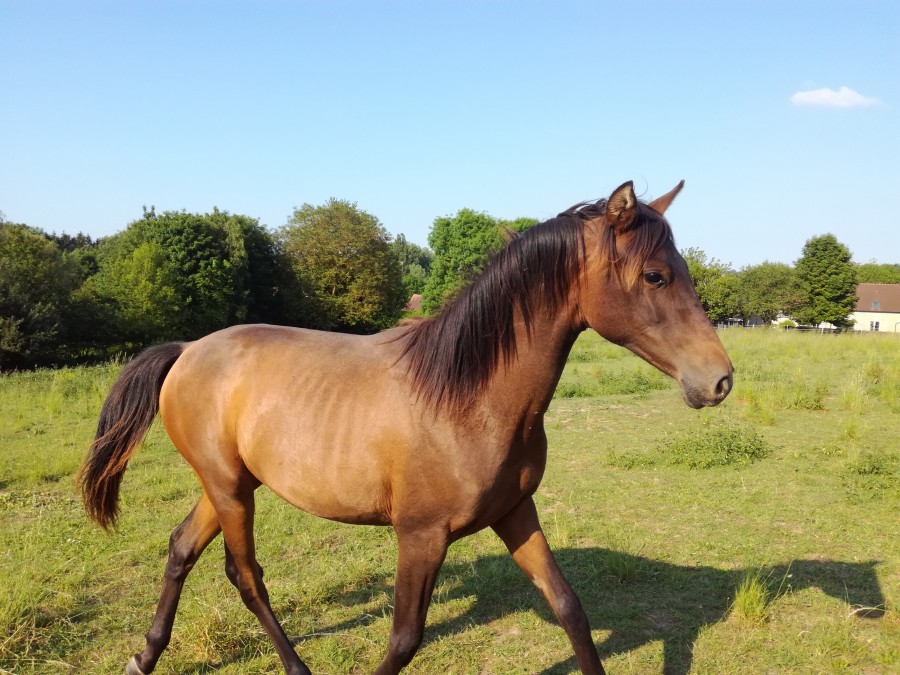 Désolé je ne passe pas très souvent donner des nouvelles de ma Khaleesi, je vous lis mais ne participe pas beaucoup. Ma belle jument grandit tranquillement dans son pré à côté de chez moi. Je vais la voir tous les jours pour la nourrir (le matin je m'arrête devant le pré pour voir si tout va bien et le soir je viens nourrir) et je ne lui demande pas grand chose.