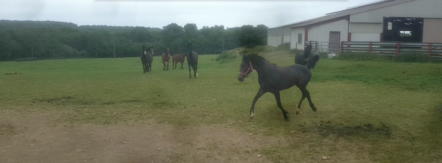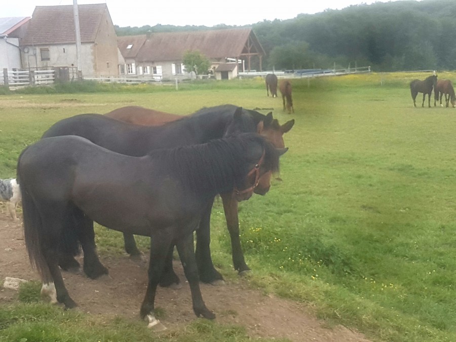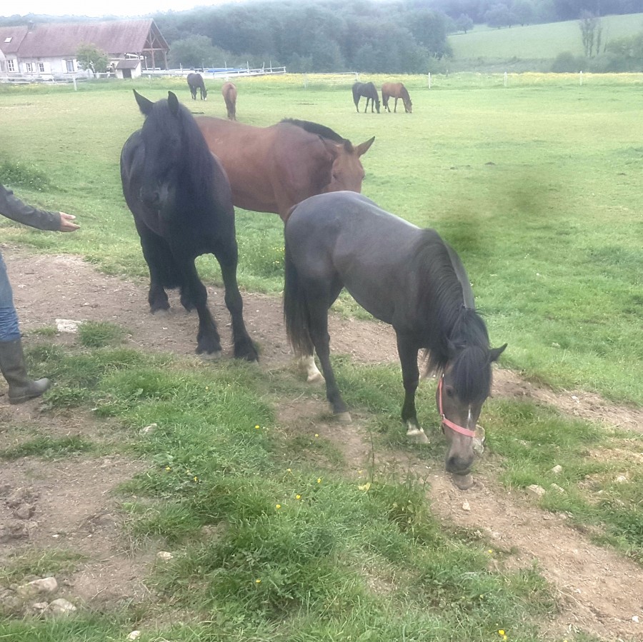 Voilà il est au pré ! Tout c'est a peu près bien passé, sauf au début où tous les chevaux lui ont couru après et qu'il a passé le fil... heureusement on l'a rattrapé. Je vous laisse imaginé la tête qu'on a fait quand on l'a pas vu revenir avec les autres. En plus on voyait pas l'endroit d'où on était, alors on a pas pu le voir sauter . Mais maintenant tout vas bien!