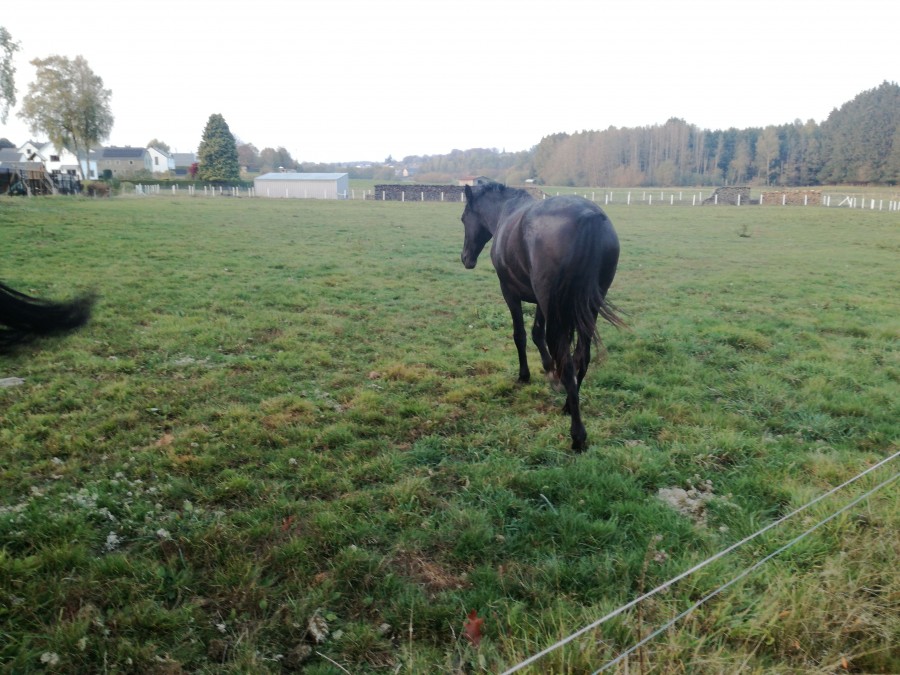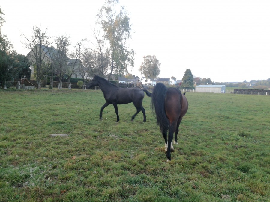 Je descends, souffle un coup, réfléchis, passe les rênes de Mamzelle dans l'étrivière et attache la longe de Genezis à son encolure.