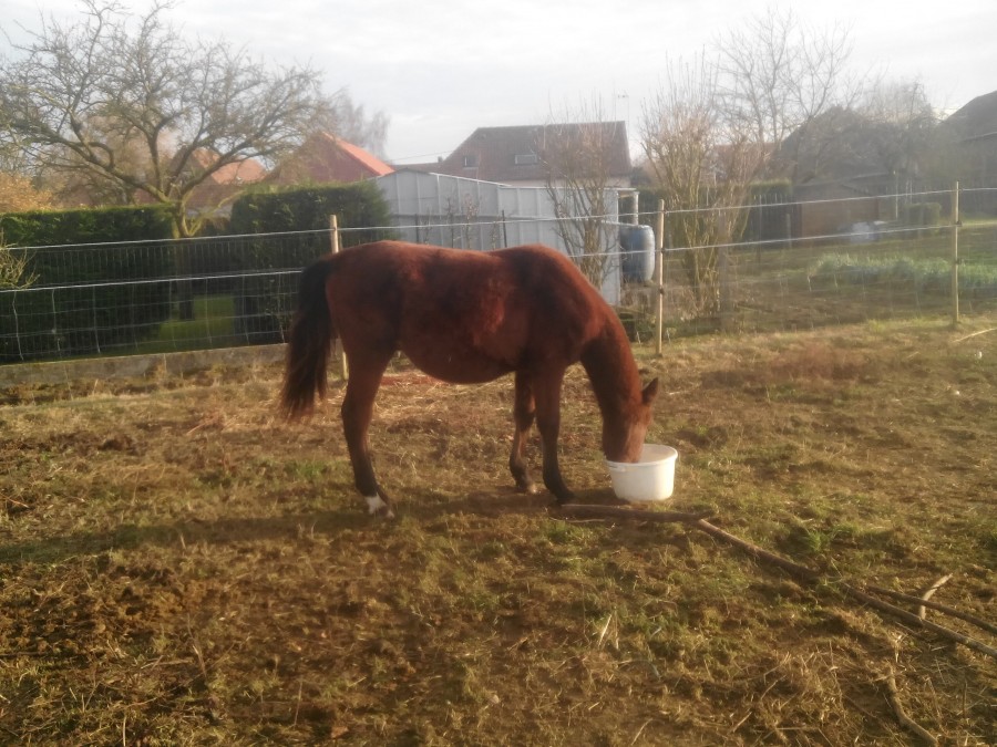 Du coup il a commencé à faire le fou dans le pré le long de la clôture (grillage + un fil en hauteur) et à sauté pour rejoindre sa mère, sauf qu'il s'est loupé pour les postérieurs... Le voilà coincé les postérieurs dans le grillage en panique à essayer de forcer le truc, j'ai réussi à le calmer et à le faire reculer, prendre son postérieur qui était bloqué dans le grillage jusqu'au dessus du jarret et lui enlever doucement.