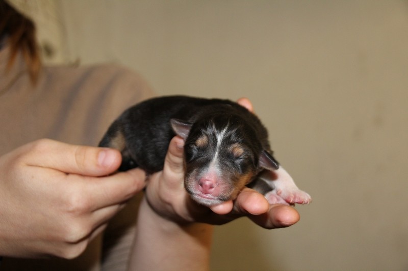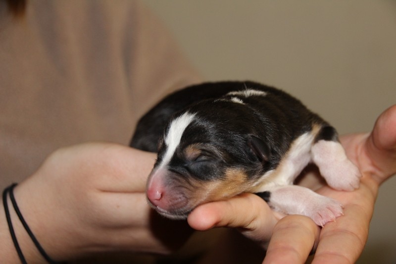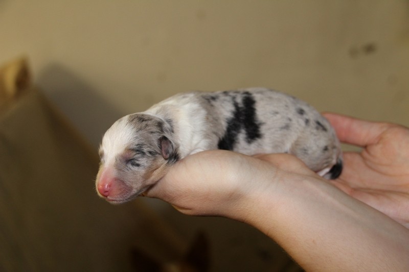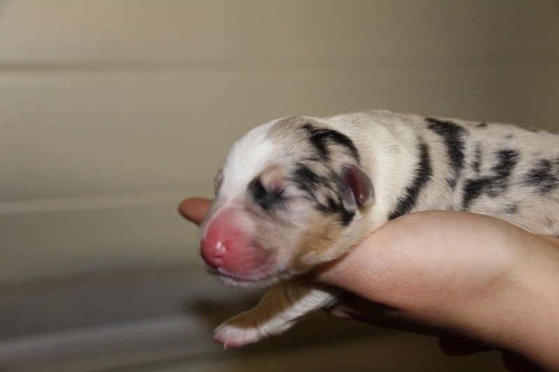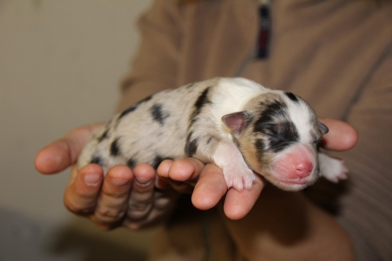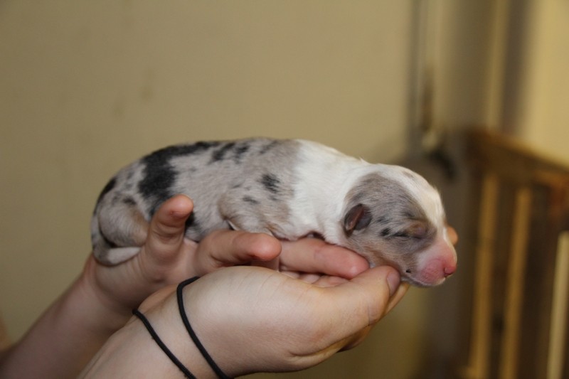 Mâle Bleu merle, le plus fatoss de la portée (100gr de plus que la plus petite)... On l'a appelé Maitre Gims du coup :