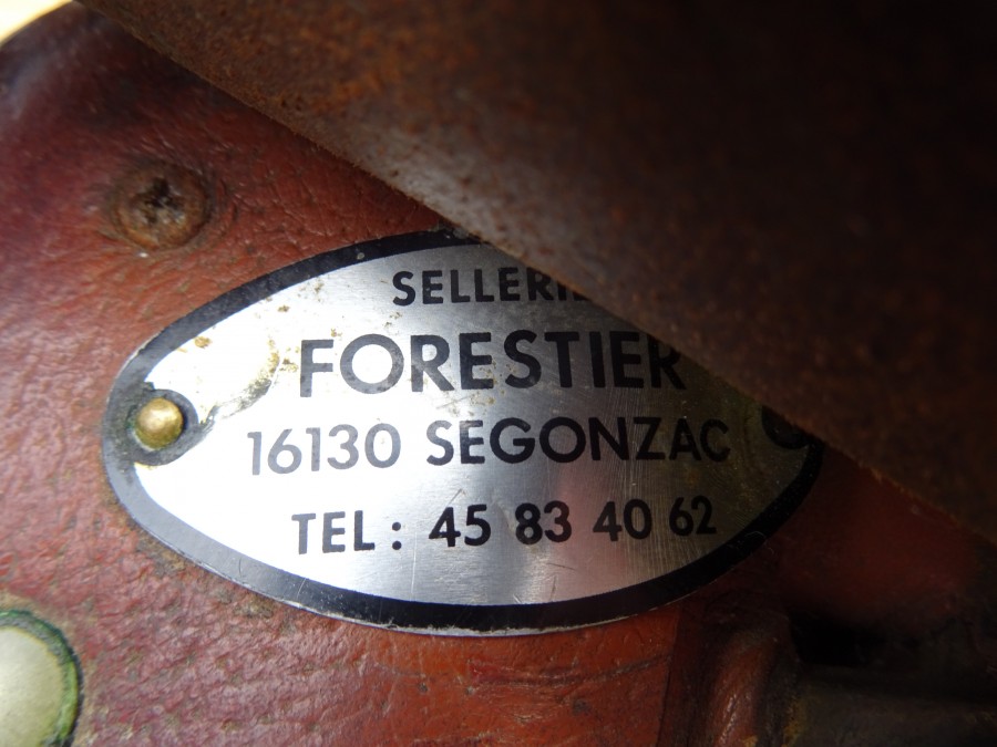 C'est une selle forestier avec des inscritions gravées dans le cuir; G.E.E sur chaque quartier, et sur le faux quartier, près de la matellassure, du coté du cheval , il y à le numéro 11 918231 de gravé, autre particularités, il y à une plaque entre la matelassure et le troussequin avec gravé " 01" et une barre et métal la ou l'on fixe les T de crouprières.