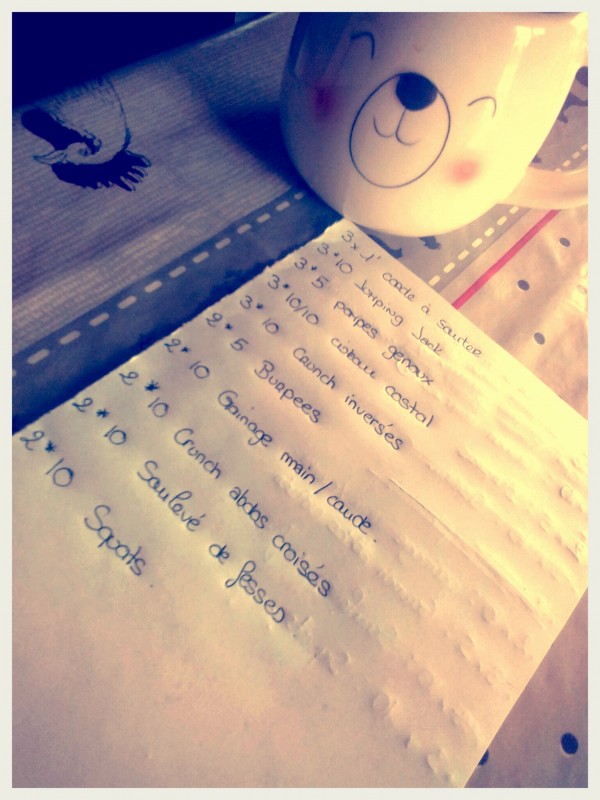 Pour la séance de ce matin, c'est une mini séance hein, juste mon réveil matinal, ça dure 6/7mn, j'ai dix mouvements dont 2m50 de gainage, ce n'est pas énorme, juste ce qu'il faut pour me mettre en jambe