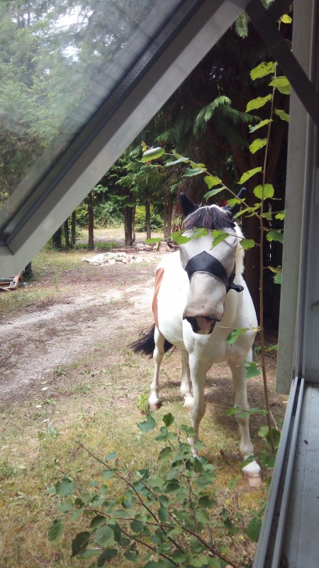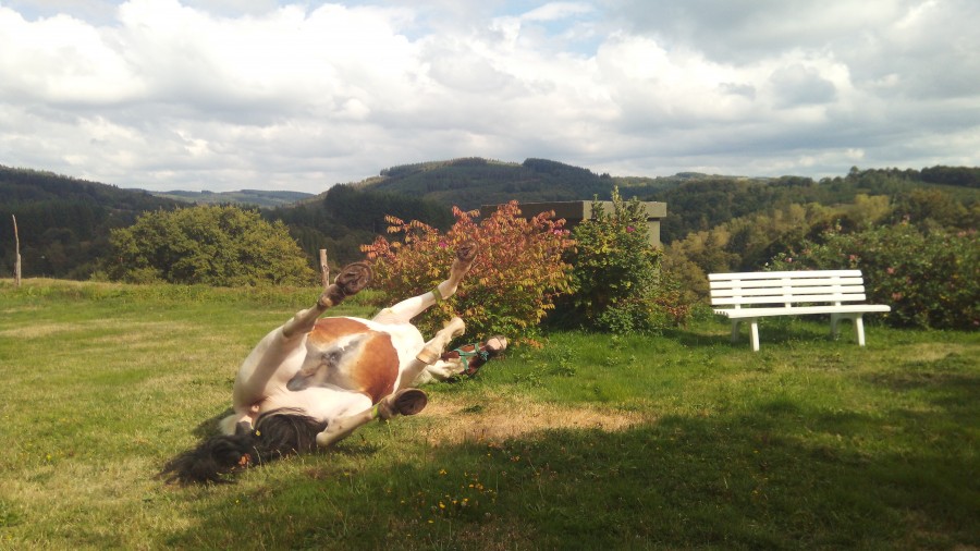 Nous sommes depuis hier à La Bourboule, où nous restons jusqu'à jeudi midi minimum. Nous logeons chez une dame très sympathique, venue à nous alors que nous attendions l'ouverture de l'Office de tourisme et qui nous a proposé de nous accueillir. Il y a ici deux chats et deux chevaux, des prés, une stabulation libre pour les chevaux. Pot' a un paddock en herbe et un abri, il discute avec ses voisins et les ânes juste derrière.