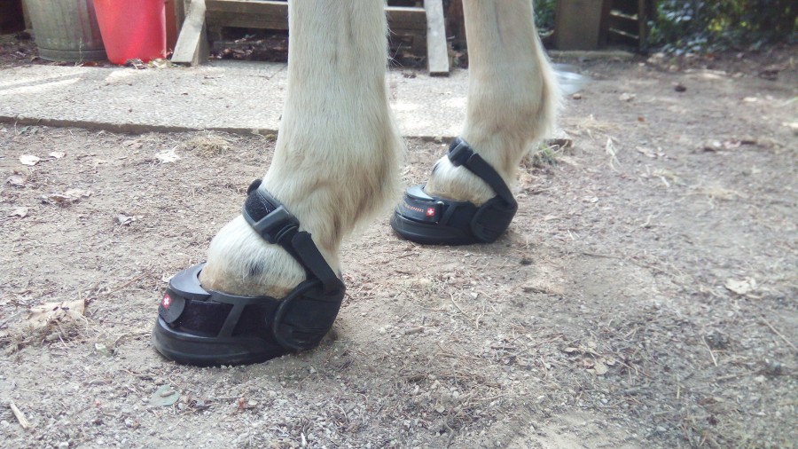 Jeudi matin, une pareuse vient faire les pieds des chevaux, et je profite de sa venue pour faire vérifier et rectifier les postérieurs de Pot', qui ont poussé fort en pince mais sans talon, de ce fait, il s'est cisaillé les glomes avec les Floating Boots, que je ne lui mets donc plus depuis quelques jours. Pas de grosse sensibilité, ni aux pieds eux-mêmes ni aux petites blessures, il reste cependant équipé de ses Swiss Galopers aux antérieurs.